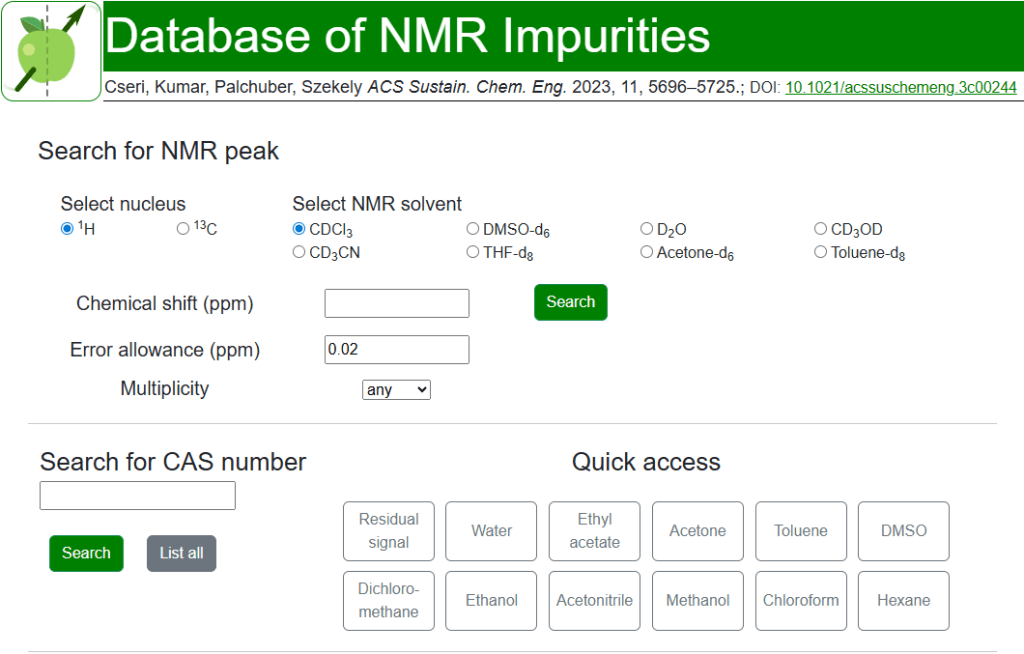 The NMR Impurities Database contains solvents, acids and basis, including the emerging sustainable alternatives, and was established in March 2023. Besides obtaining new data, we compiled the current and previous works as well. The searchable database facilitates impurity identification. This database forms the basis of an online interface through which users can browse solvent spectra and search for signals of unknown origins to easily identify residual impurities in NMR spectra. In the online Python-based application, the NMR database connects to the website using Flask. A search on the main site triggers a query from the database managed by Pandas. Read the corresponding, open-access article introducing the original database in ACS-SCE.