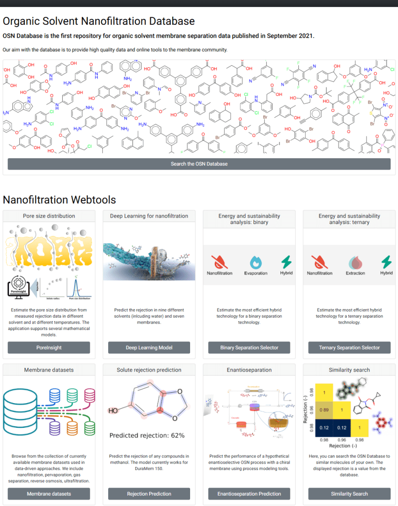 The OSN Database is the first repository for membrane separation data obtained in organic solvents published in September 2021. We envision a future where membrane process and material development relies on data-driven design methodologies. The process design part of any membrane separation are optimized and monitored using machine learning models and the new membrane materials are developed based on the collected data. The database offers several predictive tools for free to use: rejection and energy prediction, pore size distribution analysis, enantioseparation prediction, and similarity search.